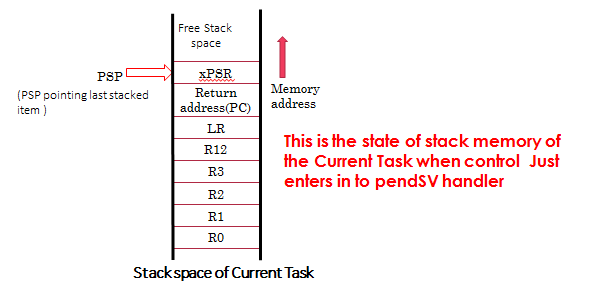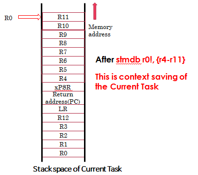 Now , R0 has PSP value right ??  So, using that PSP, we are saving the registers contents R4 to R11 on to the tasks stack memory. So, currently R4 to R11 are safe.